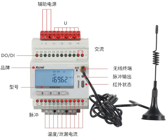 ADW300無線計量儀表主要用于計量低壓網絡的三相有功電能,具有RS485通訊和470MHz無線通訊功能,方便用戶進行用電監測、集抄和管理。可靈活安裝于配電箱內,實現對不同區域和不同負荷的分項電能計量,統計和分析。
